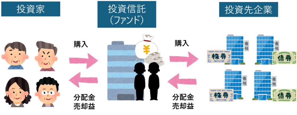 投資信託は、投資家からのお金を資金として集めて、専門家(ファンドマネジャー)が国内、国外の株式や債券、不動産など決定した投資先に投資することで運用されています。別名「ファンド」と呼ばれています。