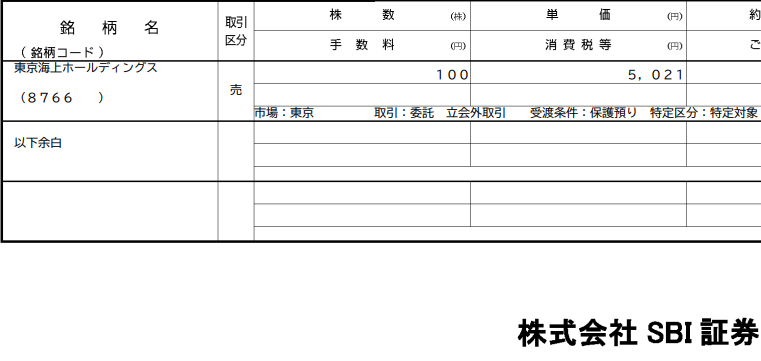 今回は個別銘柄(東京海上ホールディングス<8766>)の売却レシート(領収書)でした。