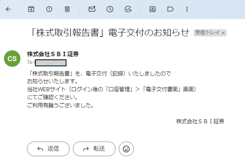個別銘柄(例えば、ソニー、トヨタ、NTTなど)の売買を行っている場合は、その都度交付されます。しかちゃんと同じように、このようなメールが届くはずです♪(2024年5月現在)