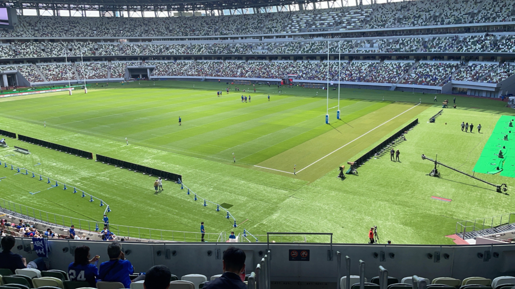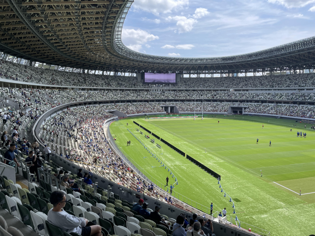 右手は観客席という感じです。大きなモニター画面がしっかりと見えます。たぶん国立競技場の中で一番大きなモニターです。ラグビーのTMO(テレビジョン・マッチ・オフィシャル)の時には、このモニターで、しっかりと状況を確認することができました。ただ、グランドが左手にあるため、個人的には、TMO以外は右手側のモニターに注目する事は殆どありませんでした。