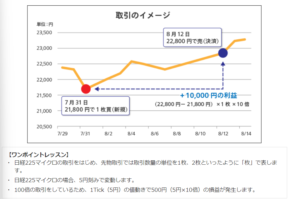 例えば、日経225先物のミニでは、日経平均株価(日経225)を100倍した金額が1枚です。日経225マイクロ先物では、10倍した金額が1枚で、日経225ラージ先物では、1,000倍になります。
