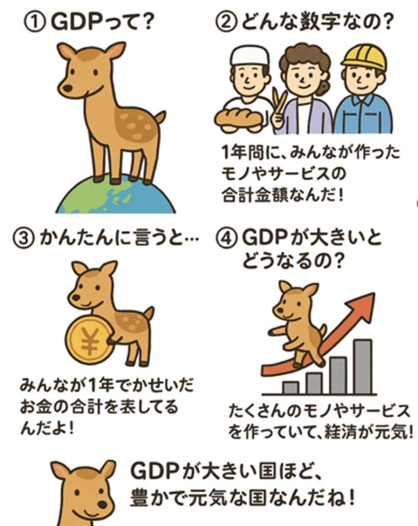 GDPは「Gross Domestic Product(グロス・ドメスティック・プロダクト)」の略で、「国内総生産」っていう意味だよ。日本では、GDPのデータを内閣府が3か月ごと(四半期)に発表しているよ。