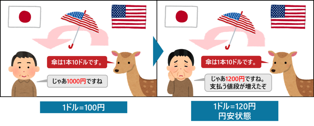 例えば、1ドル=100円のときであれば、10ドルのモノを購入する際には1,000円が必要です。しかし、円安が進み、1ドル=120円になると、10ドルのモノを購入するためには1,200円が必要になります。