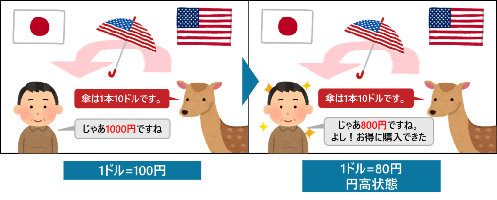 例えば1ドル=100円のときであれば、1,000円で10ドルのモノを購入できます。円高が進み、1ドル=80円になると、10ドルのモノを購入するためには800円で済ますことができます。つまり、円高になったことで日本円の価値が上がったと言えます。